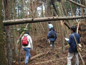 昨年の台風の影響で、杉林はこんな感じで倒れている。この倒木を踏み分け踏み分け、栗林ツアー御一行様は進んでいく。