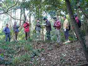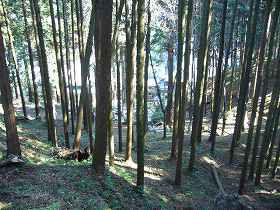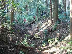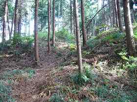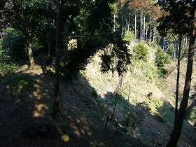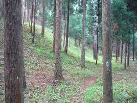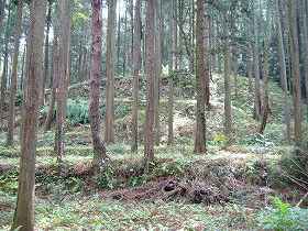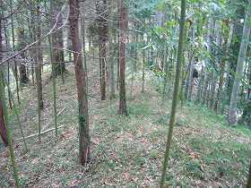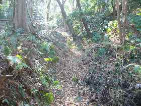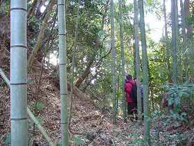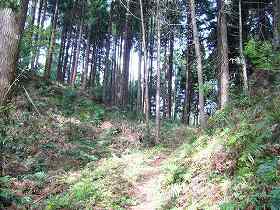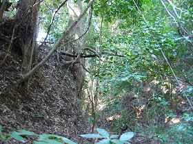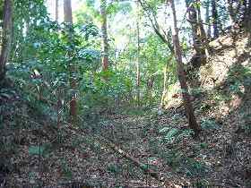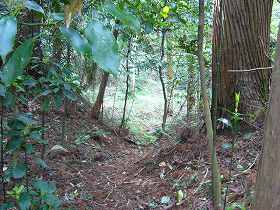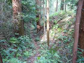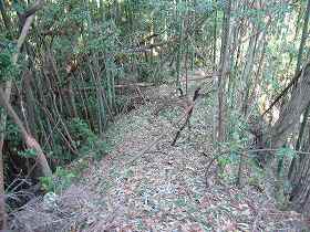 | Cから下側に降りていく道。これも本来の登城道であった可能性がある。下のほうでは道が湾曲し、堀切状の部分を通過するようになっている。 | 山麓の、尾根が突き出した部分。幅6mほどで、30mくらいの長さがある。このような尾根状部分は八箇所ほどあり、その間の谷戸部分が段々の削平地になっている。 |