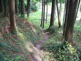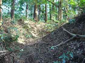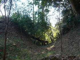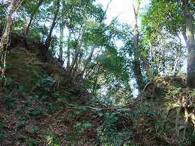 | 尾根の辺りから本郭方向を見たところ。郭が数段になっているのがよく分かる。法螺貝状に見える部分である。 | 尾根との間を切り通している部分。堀切兼通路といったところであろう。 |