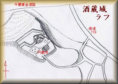 酒蔵地区に、千葉東金道路によって北端が削られている比高20mほどの台地があるが、その南側にある円蔵寺が酒蔵城の跡である。台地の最高所ではなく、中程の部分に築いているのがこの城の特徴であると言えるだろう。今回はちゃんと歩く時間がなかったのでラフにしてしまったが、次に訪れた時にはもう少しきちんとしたものに描き直してみたいと思う。