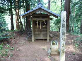 | (以前の記述)田間城は、写真の田間神社の後方の山上にあった。比高30mほどの山で、東金城の東北2kmほどの位置にあたる。山上への登り道は分からなかったが、「概念図」によると、山上には中心となる二つの郭があり、その周辺に腰曲輪などが何重かに巡らされている。竪堀も何カ所かあり、一郭と二郭の間には、土塁や空堀もある。 田間城は永正6年(1509)、酒井定隆によって築かれたという。定隆は土気城からここに移ってきたが、この城は狭隘だったので、やがて東金城を築き、そちらへ移っていったのだというのである。 |