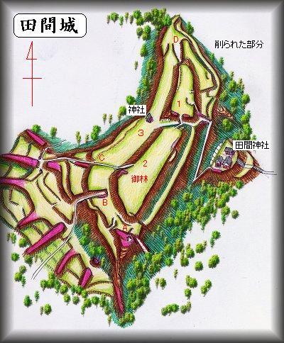 東金市田間の田間神社の背後の比高30mほどの台地が田間城の跡である。田間神社の南側の隅辺りから、台地に登っていく山道が付いているので、ここから上がっていくとよい。台地上には堀切で区画された1,2の2つの郭があり、これが背骨となっている。城内はわりと藪が少なく、歩きやすい上に見通しもよく利くのがうれしい。地元の古老の話によると、何十年も前にはこの台地は「田間公園」という公園として整備されていたという事で、1郭を「本丸」2郭を「御林(おはやし)」と呼んでいたという。そういうこともあってであろうか、現在も山の手入れが行き届いているように感じられて、好感が持てる。