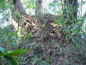 | これも堀切の名残であろう。 | 尾根の先端部近くには土壇状の盛り上がりもある。 |