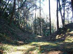 | 田間神社の参道。脇に公民館があるので、車を留めておくこともできる。 | 1郭と2郭との間の堀切。幅は10m以上ある。2郭側は切岸状にはなっていない。後世の改変によるものであろう。 |