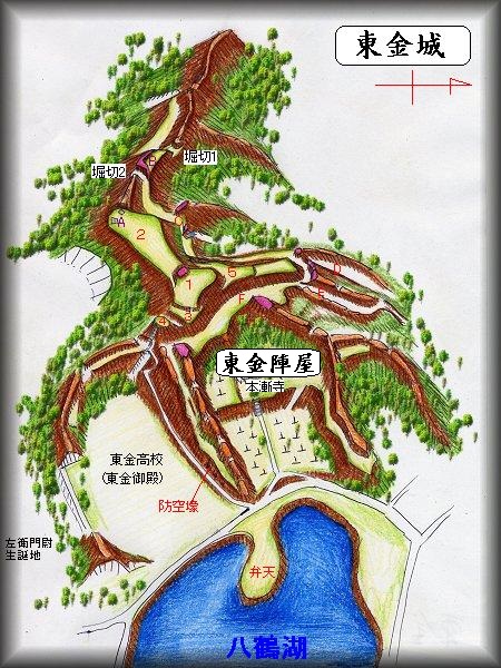 八鶴湖の西側にある山稜一帯が東金城の跡である。八鶴湖越しにみる東金城はいかにも古城という感じで、これがまたなかなかいい雰囲気なのだが、ちょうどいい写真がなかったので、それをお見せできないのが残念だ。さて、「東金城測量図」を参考にしながら鳥瞰図を描いてみたのだが、城域がけっこう広いので、細かいところまでは描ききれていない。