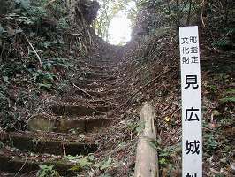 | 東南側から見た見広城のある台地。細長く南に突き出している。右側の一番高い辺りが1郭で、先端に行くにしたがって段々に郭が配列されている。 | 台地基部との間にある大堀切。深さ10m、幅20m以上ある。もともと天然の沢があったのだろうが、基部との区画のため、それをさらに掘り下げたものだろう。左側が1郭の城塁。 |