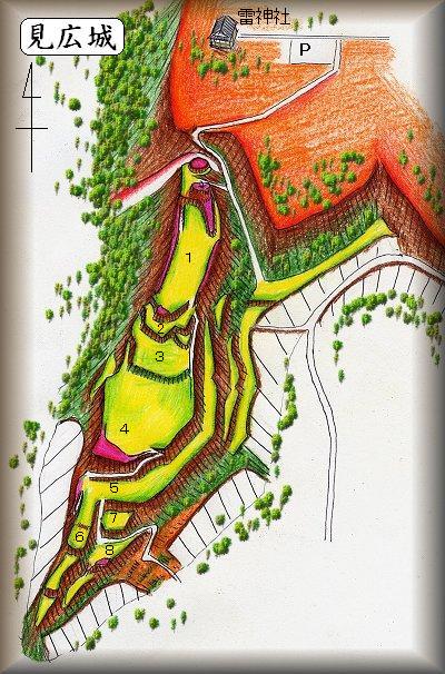 (以前の記述)比高40mほどのの切り立った台地先端部にある見広城は、島田三河守義広の居城だったといわれる。かつての椿湖を望む見晴らしのよいところにある。台地上を堀と土塁で数郭に分けているが、遺構の保存状況は良好である。雷神社の脇に「雷神社、見広城駐車場」があり、左手の民家の脇を通っていくと、すぐ案内板が見える。城址碑も2カ所にある。 創立年代は不明だが、伝承によると、永禄年間に(この年代には疑問がある)里見の武将正木時忠によって攻められ落城したという。 |