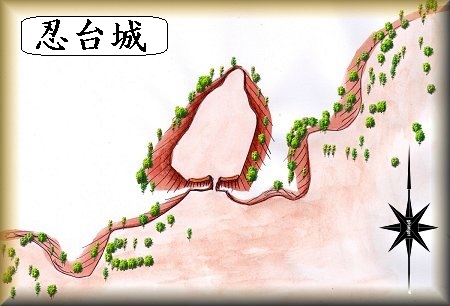 という感じで遺構は残っていない、そこで明治の迅速測図を見てみると、右の鳥瞰図のような地形が見えている。現在、この台地の中央を通っている国道はかつては台地下を通っていたようである。