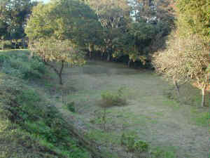 本丸の虎口から土橋越しに二の丸を見たところである。右側の堀は幅20mほどと実に広い。かつては、畑地になっていたので、このように平坦であるのだが、実際の堀底はこの何mも下なのかもしれない。掘ってみれば、障子や畝などが出てきそうな気がする。