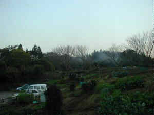 本丸の土手越しに、田久里砦方面を見る。前方の岡の先端近くが、田久里砦のあった所である。この先端部から左に降りた所に全体の大手口があったと言われる。その場所は、国道296号線と王子台方面から来る通りとが交わる交差点になっている。現在も大きな交差点だが、当時も交通の要所であったろう。