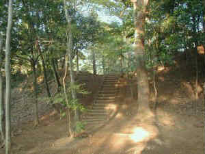 主郭部は、100×60ほどの郭で、南側に腰曲輪がある。また郭内には1mほどの段差があり、2つに区画されている。写真は虎口で、両脇の土塁は櫓台のように高く盛ってある。現在虎口は2ヶ所あるが、かつては左側の1ヶ所だけであったと思われる。右側手前には空堀があるが、これは幅10mほどの大きいものである。深さは浅くなっているが、かつてはかなり深いものであったろう。規模の大きさからみて、戦国時代に構築されたものであろうと思われる。