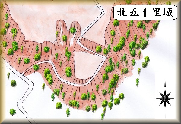 五十里の海岸に臨む比高50mほどの台地上に段階的に2郭がある。この下の比高30mほどの所にある、方50mほどの部分を「下の城」、比高50mほどの所にある、やはり方50mほどの上の部分を「上の城」(そのままだ!)と言っている。また登り口を「城の腰坂」と呼んでいる。
