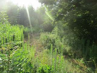 親切なことに地主さんが、城の登り口まで案内してくださったのだが、かつての登城道は完全にヤブに埋もれてしまっていて、とても入り込んで行けるような状況ではなくなってしまっていた。「山にはマムシもいるので、注意しないと危ない」という話も聞いた。