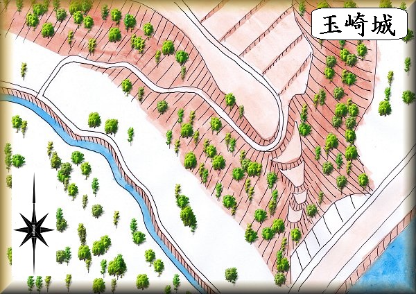 玉崎城は、「坊が崎」のバス停のすぐ北側にそびえる、比高50mほどの山上にあった。すぐ南側には、玉川、坊ヶ浦川に囲まれた小扇状地がある。