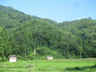 地元で城の山と呼ばれている山であるが、『新潟県遺跡地図』が示している場所は、城の山の北側の山稜である。実際、その山稜には城を築きそうな地形が見えている。
