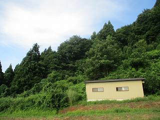 | 南方から遠望する城の山。 | この小屋の脇から登城道が付けられていたというが、現状ではヤブに埋もれてしまっている。 |