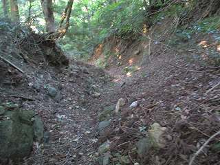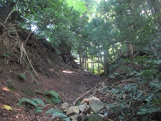 下の集落から上に登って行くと、城址方向に続く大規模な切通しが見えてくる。これはかつての道の跡であろうか。ただ、堀切の機能も兼ねていた可能性がある。