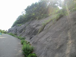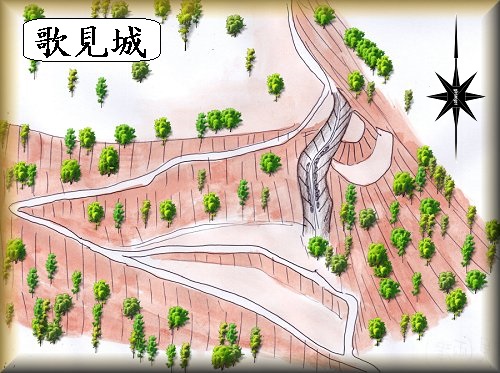 | 下の神社から見上げる歌見城。 | 城の背後にある切通し。 |