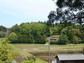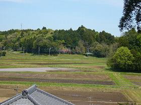 根古屋城の北東方向に向かい合う台地には岡田砦があったという。用草城の北側にあたる。(用草城の台地が写真の右端に映りこんでいる。)