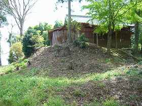 | 東側の用草城の下から見た根古谷城の全景。沼沢地に突き出した比高10mほどの低い台地である。 | 1郭にある天満宮。本殿の建っている所は、まさに櫓台といった雰囲気の場所である。 |