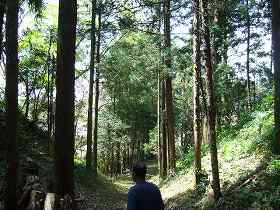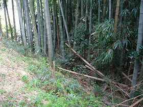 | 2の南側の城塁。郭内からの高さは2m程度であるが、郭外では、7〜8mほどある。 | 1郭東南側の大堀。深さ6mほどで、台地下まで接続している。堀底道としても使われていたのであろう。 |