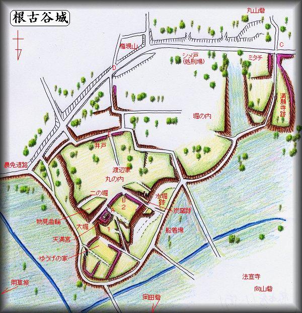 | 根古谷城の創建は明らかではないが、享徳年間(1542〜55)、千葉一族の家臣であった円城寺氏によって築かれたのではないかといわれる。 後に康正元年(1455)に、千葉一族の内紛によって千葉氏が没落していくと、円城寺氏も滅びたという。 その後は同じく千葉家臣団の粟飯原氏が城主になったという。粟飯原氏についても詳細はよく知らないが、千葉氏の家臣であり、岩富原氏などと密接な関係があったものと推測される。 |
