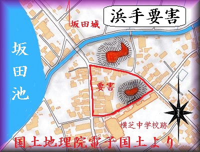 明治の迅速図を見ると、坂田池の範囲は現在よりも大きく、浜て要害のすぐ西側近くまで池が及んでいた。戦国時代にはさらに坂田池の範囲は広く、浜て要害のすぐ側面部まで来ていたのかもしれない。「浜手」という名称も、そうした位置取りに関係したものなのだろう。