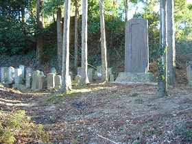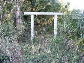 | 長勝寺から背後に登ると、一段高い所に古そうな墓地がある。その背後にそびえている部分は櫓台形状をしている。物見台であろう。 | 1郭東南下に祭られている祠。この上が1郭である。 |