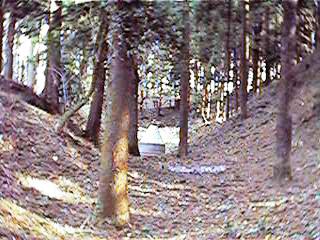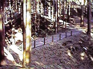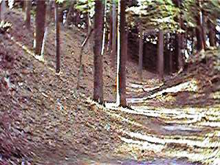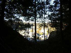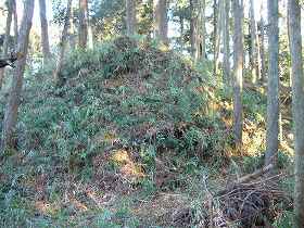 | 2郭北側の土塁。削り残しによるものだと思われるが、高さ5mほどもあり実に重厚な土塁である。この先が堀切となっている。 | 2郭北側の堀切。深さ5mほど。東南に回りこむようにして弧を描いている。 |