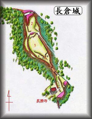 | (以前の記述)長倉城は、小提城・浜手城と共に坂田城の3要害と呼ばれた支城の1つである。 坂田城の1kmほど西にある比高20mほどの台地で、坂田城の西側の、守りを固めていたものであろう。 天文年間の頃の坂田城主であった三谷大膳亮信慈の弟、胤良がこの城にいて「長倉殿」と呼ばれていたという。 城址には土塁や空堀などが残っている。台地の南側に長勝寺という廃寺があるが、写真はその寺の脇から台地を見たところである。 |