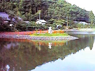 城址には土塁や堀などが残っている。写真は城址の脇にある池にあった新しい弁天様だが、この池は城址の南側を取り巻くように位置しており、かつては城の堀だったものであろうか。