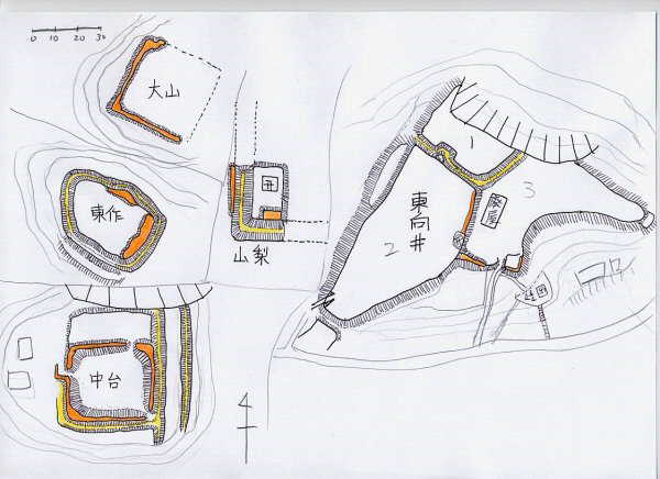 四街道のいくつかの城をほぼ同じ縮尺で並べてみた。ざっと歩いただけなのでかなり適当だが、このような単郭の単純の構造の城館が四街道には多いのである。