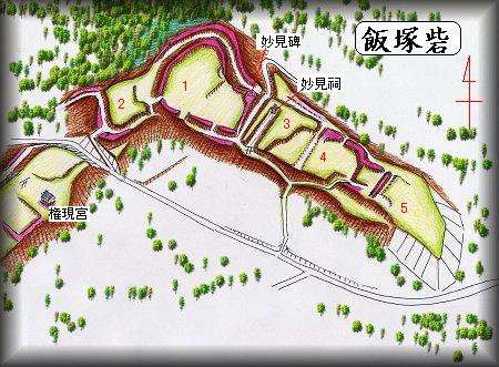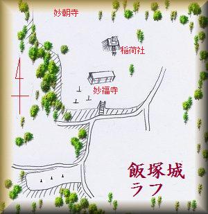 飯塚砦は御城山(八つ山)にあり、「御城山砦」とも言われる。城址には図にもある妙見宮や権現宮があるので、これを目標にしていけばよいであろう。ただし、下の道路に鳥居などは建っていないので、登り口を捜すのはちょっと難しいかもしれない。光福寺の東側の比高20mほどの台地一帯である。