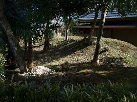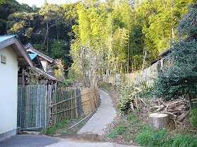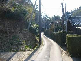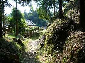 | 松山神社の参道。この参道が堀の跡で、両側が土塁の名残のようにも見えるのだが、実際はどうであっただろうか。 | 参道の東側には、わりとそれらしい土塁が残っているが、民家の区画のためのものかもしれない。 |