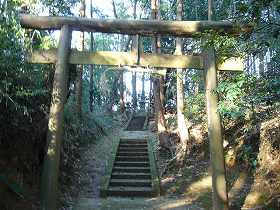 | 妙見神社の入口。鳥居が建っていないのでちょっと分かりにくい。 | 妙見神社の祠がある所。参道は郭を分断して付けられたものらしい。 |