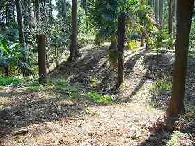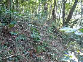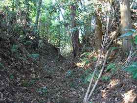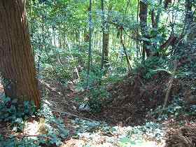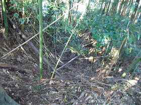 | 5の郭西側にある土塁と堀の跡。ただし、高さは2m未満で、規模は小さい。 | 妙見祠の西側の堀切。深さは3mほどである。 |