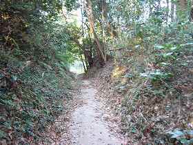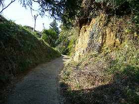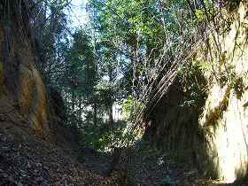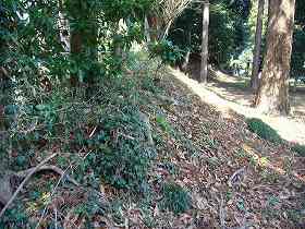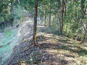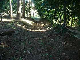 | 北西側の続きはひたすら長い細尾根となっている。上総ではよく見られるが、北総の台地にしては珍しい地形である。 | 稲荷神社の東側の郭の下の切り通し。 |