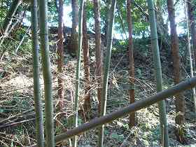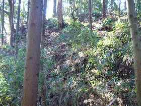 | Aの辺り入口。ここをどんどん上がっていけば1郭の入口に出るのだが、何しろ場所が分かりにくい。 | 1郭北側土塁の背後は高さ8mほどの鋭い切岸となっている。 |
