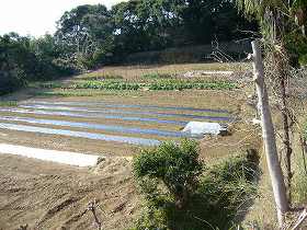 | 2郭との間にある堀切。深さ3mほど。 | 1郭南側の平場にある、おばあちゃんの畑。花大根や三つ葉など、さまざまなものが植えられている。おばあちゃんのお気に入りの畑であるということであった。桜の花も咲いている。 |