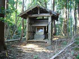 | 星宮神社のすぐ手前にあるBの竪堀。規模はかなり大きいのだが、ヤブのためになんだか分からない写真にしかならない。 | 星宮神社。この周囲にはしっかりとした土塁が巡らされている。 |