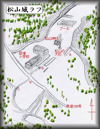 このような状況で、松山城がどんな城であったのか、現状ではさっぱり分からない。おそらくそれほど規模の大きくない城館であったのではないだろうか。伝承通り、松山神社がその位置であると想定してよさそうであるが、もしかすると、台地南端部辺りに何らかの付属施設が置かれていた可能性もある。