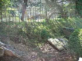 Aの土塁は南側も分断されてしまっているようだが、台地の南端部分まで行ってみると、そこにはBの土塁が残っている。この土塁は本来はAとつながっていたのであろう。Bの上にも墓がびっしりと建っているのだが、L字型に折れている形状はよく分かる。またBの西側には深さ8mほどもある堀切の残欠が見られる。この堀切があるいはかなり北側まで延びて、城を区画していたのではないかと推測されるが、現状ではかなり埋められてしまっているようで何ともいえない。また、Bの東側の端にも土塁が残っており、その東側下には堀切の名残と竪堀が見られる。台地上はかつては、けっこう細かく区画されていたのかもしれない。