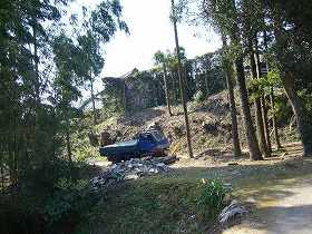 | 広域農道によって切り通された部分。東側から見たところである。左手がAの部分。 | 南端のDの郭を下の腰曲輪から見たところ。周囲はするどい切岸で、Dはいかにも物見台のように見える。 |
