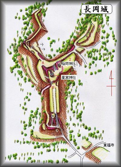 長岡城は長岡地区の北西端にある比高10mほどの台地上にあった。地図には掲載されていないが、ここには星宮神社が祭られているので、これを頼りに探していけばよい。ただし、神社の入口はけっこう分かりにくく道も細いので、見つけるのにはちょっと苦労する。東福寺の南西側100mほどの所から台地に上がる道が見えるのでここを進んで行けばよいのであるが、道も細く、犬にやたらと吠えられてしまう。