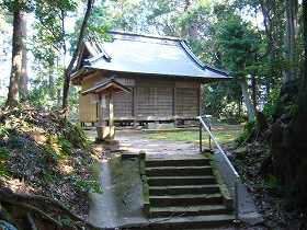 | (以前の記述) 長岡城は、西1kmの所にあり、大浦城と同様、北の飯高氏に対する備えとして築かれた城であろう。城主は、椎名一族の長岡氏であるという。 城址のある台地は、南側から延びているものだが、東福寺との間を深い切り通し道が走り、台地の基幹部とは切断されている。その切り通し道を西に出て山の裾を巡るように登っていくと写真の星宮神社がある。ここが城の中心部であろう。 神社のすぐ手前には写真のような土塁があり、そのすぐ脇には深さ5mほどの堀が掘られているのがはっきり分かる。神社へ上がる石段の途中にはもう1カ所、堀の跡らしきところがある。 |