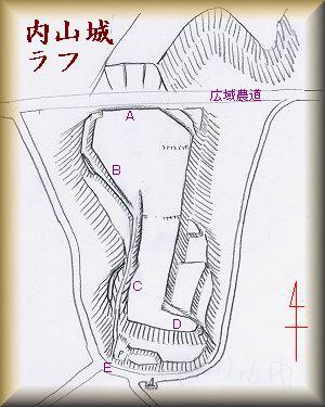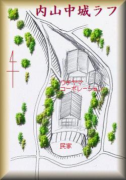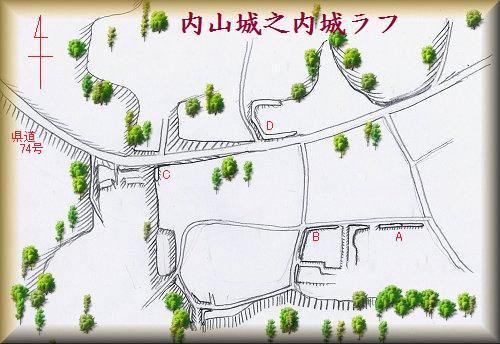 | (以前の記述)中城は内山城の300mほど北西にある小規模な砦の跡である。内山城ので城であったと思われる。この他にも、1.5kmほど北方にも「内山城」と呼ばれる城址があるが、こちらも内山城の出城なのかどうかはよくわからない。 | |