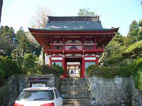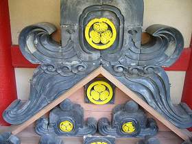 | 西光寺の山門。この背後の台地に土塁などが残されている。 | 西光寺の山門には古い瓦が置いてあったが、ここには葵のご紋がくっきりとデザインされている。徳川家と関係の深い寺院なのであろうか。ただ、この色はちょっと・・・・黄色に塗らない方がよかったと思うのだが・・・・。 |