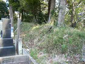 1郭のある台地の東側の下に、半島状に出張った2の部分がある。ここも一面の墓地になっていて、改変著しいのであるが、この東側の先端には土塁が見られる。ということからすると、この2の部分が2郭ということになるであろうか。