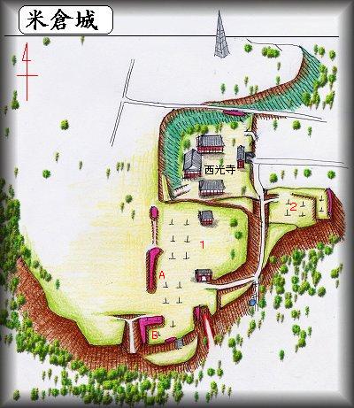米倉の西光寺の背後の台地が城址である。西光寺はかなり立派な寺院で、墓地も広大なのだが、場所がとても分かりにくい。国道126号線と北側に平行して走っている市道に伊藤医院という病院があるのだが、その脇辺りに「西光寺」入口の看板が出ているので、それを探すとよいだろう。ただし道は車の交差もできないくらいにとても狭い。