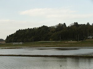 | 南西側から見た大堀城。左側の先端部分が城内となっている。 | 中城南側の虎口の土塁。といってもヤブがひどくて何が何やら・・・。高さ2mほどで、幅広なので、それなりに大きな遺構ではあるのだが・・・。 |